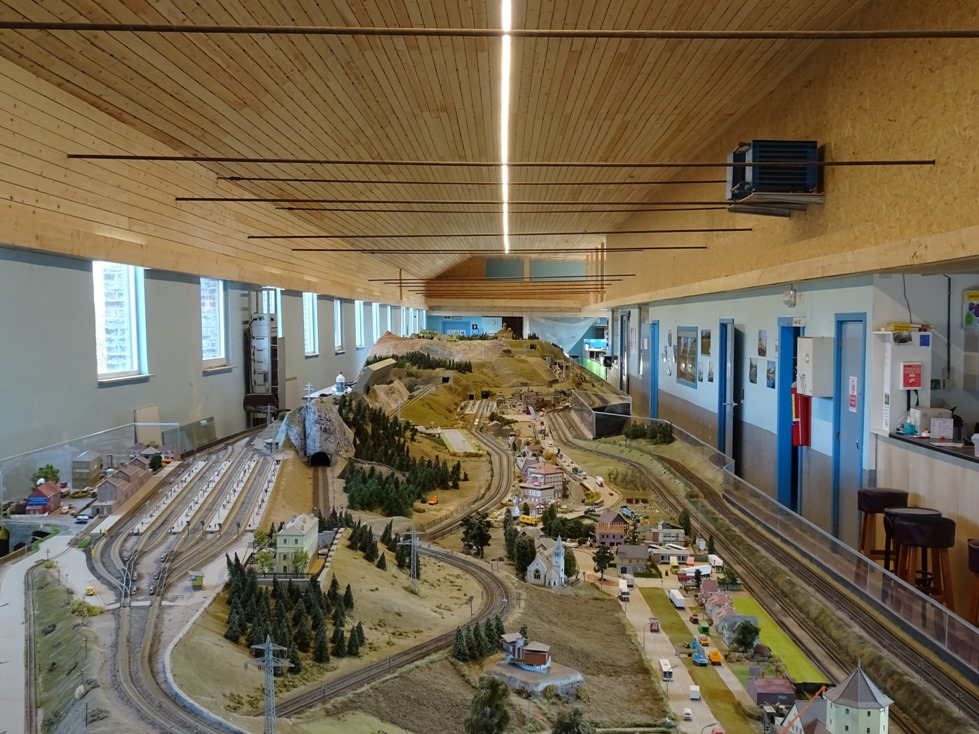 Vaste modelspoorbaan van 44 op 4 meter, dus lange treincombinatie mogelijk.